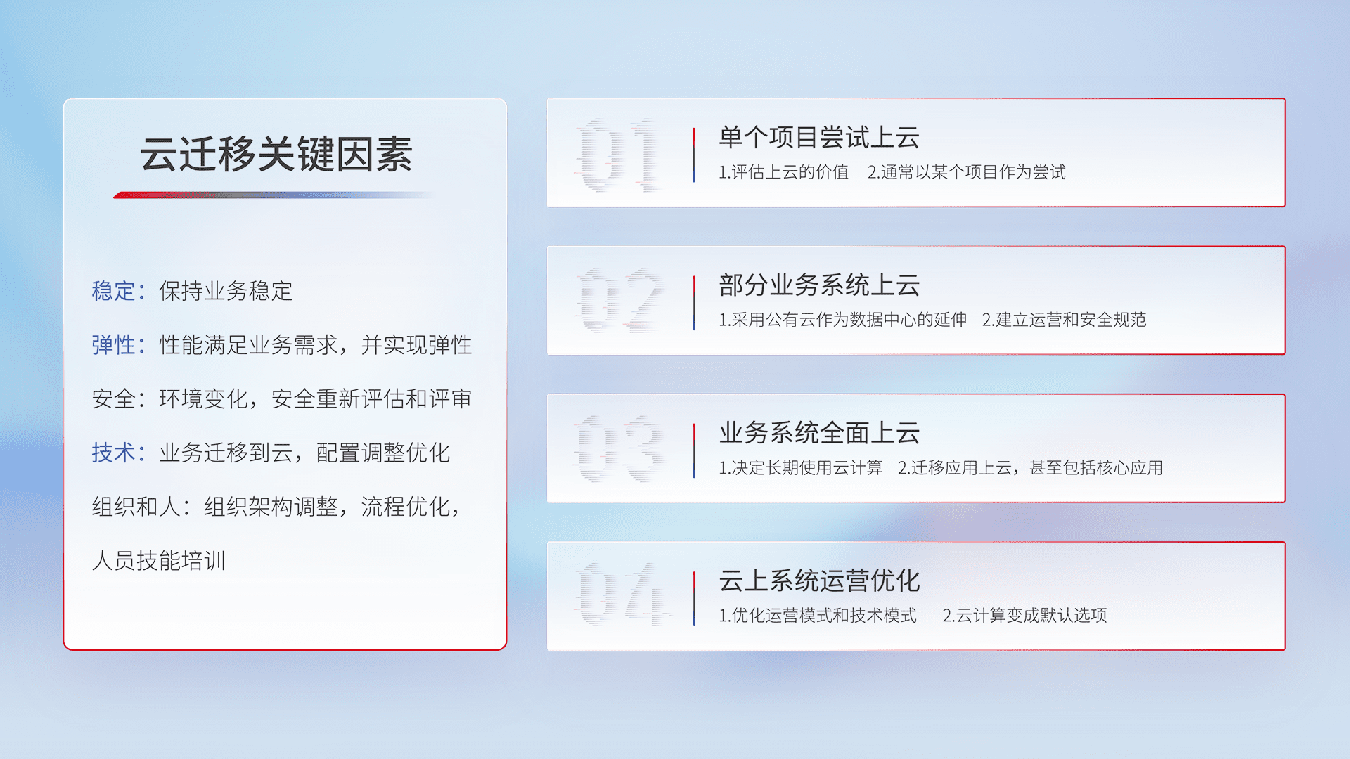 结合实际业务,,,从规划设计、、、云平台选型、、云原生改造、、数据迁移、、、、集成交付,,,,迁移全过程为客户识别最佳上云路径,,,做好风险识别管理,,,,设计网络架构、、、、身份权限、、、安全审计合规、、、操作审计、、、、日志审计、、、、监控告警策略、、、、多站点容灾设计等,,,对云上基础设施进行整体规划,,,提升IT治理水平,,,,以满足弹性、、高可用、、、、高性能的需求。。