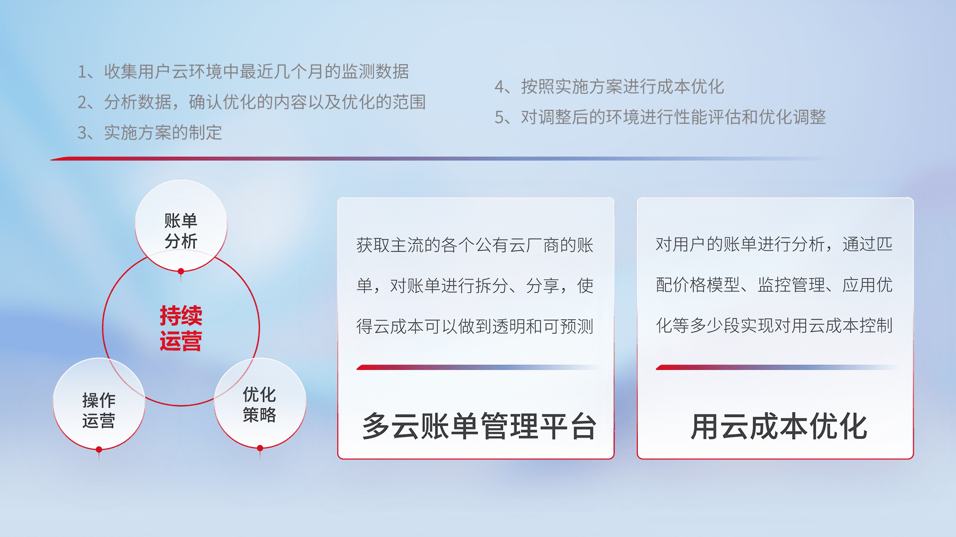 通过多云纳管,,,以统一的资源数据模型把客户的云资源进行抽象和封装,,,,进而实现对多云资源的统一操作,,,,保障云资源管理的可靠性、、、、稳定性与可用性。。量身定制化运维内容,,配置、、开发运维、、补丁管理、、、备份、、监控、、、认证和访问管理、、、审计和日常巡检等,,保障在用云过程中的可靠度,,,,稳定度以及高可用率。。。